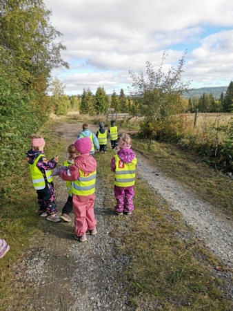 Vi er mye ute – både på barnehagens eget uteområde og på tur i nærmiljøet. Storbarn har faste turdager til gapahuken «Tuva», hvor vi spiser lunsj og av og til lager mat på bål. Småbarna utforsker området rundt barnehagen og drar på små turer tilpasset alder og behov. Med skiftende årstider og vær byr hver tur på nye opplevelser, undring og læring.